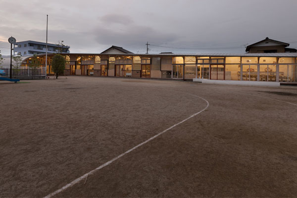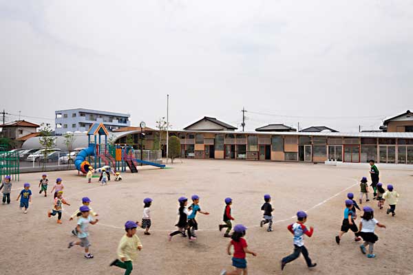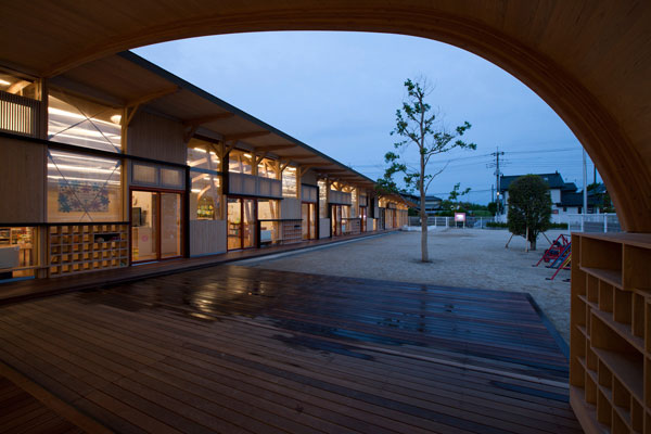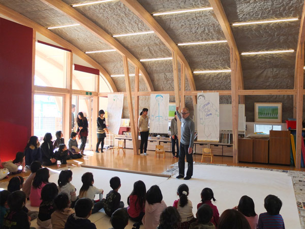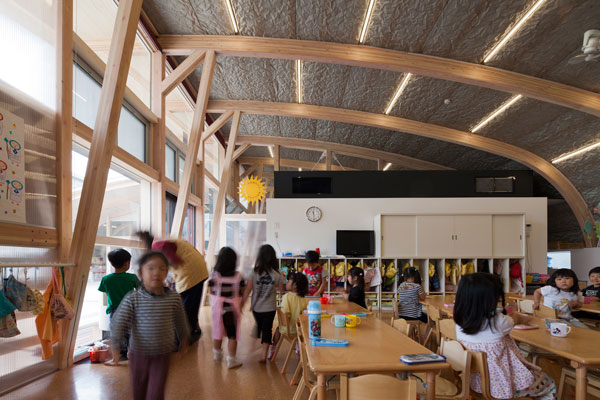 クジラの背中のようになだらかにカーブした屋根、広々とした内部空間で、子供たちの笑い声が響きます。
